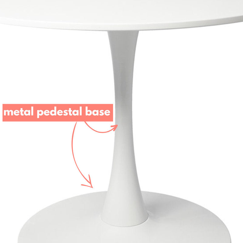 - Sturdy design: This round dining table features a durable white tulip metal base that supports a smooth white top.